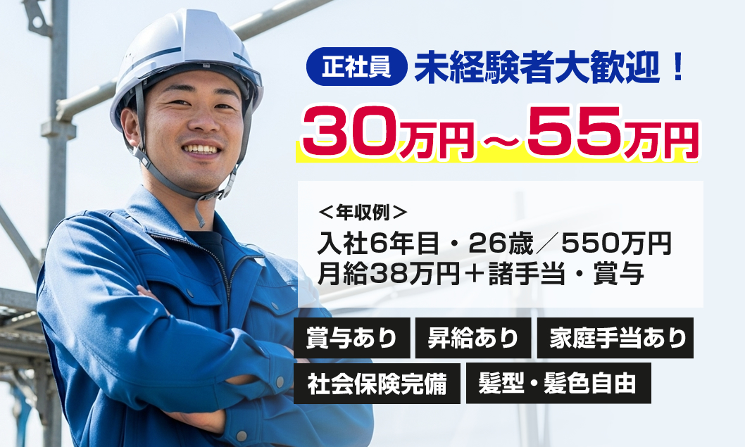 | 勤務時間 | 8:00~17:30 *現場により集合時間が変わります。 |